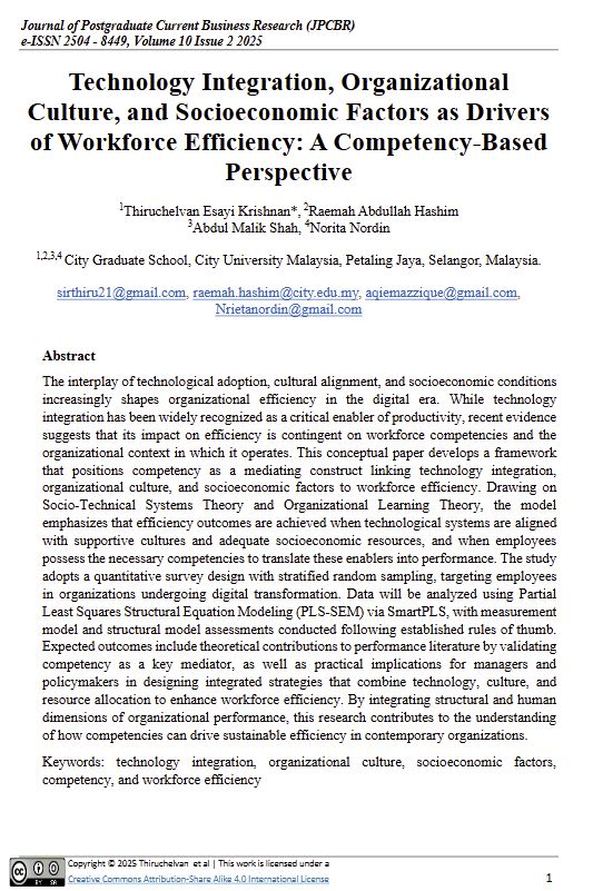 The interplay of technological adoption, cultural alignment, and socioeconomic conditions increasingly shapes organizational efficiency in the digital era. While technology integration has been widely recognized as a critical enabler of productivity, recent evidence suggests that its impact on efficiency is contingent on workforce competencies and the organizational context in which it operates. This conceptual paper develops a framework that positions competency as a mediating construct linking technology integration, organizational culture, and socioeconomic factors to workforce efficiency. Drawing on Socio-Technical Systems Theory and Organizational Learning Theory, the model emphasizes that efficiency outcomes are achieved when technological systems are aligned with supportive cultures and adequate socioeconomic resources, and when employees possess the necessary competencies to translate these enablers into performance. The study adopts a quantitative survey design with stratified random sampling, targeting employees in organizations undergoing digital transformation. Data will be analyzed using Partial Least Squares Structural Equation Modeling (PLS-SEM) via SmartPLS, with measurement model and structural model assessments conducted following established rules of thumb. Expected outcomes include theoretical contributions to performance literature by validating competency as a key mediator, as well as practical implications for managers and policymakers in designing integrated strategies that combine technology, culture, and resource allocation to enhance workforce efficiency. By integrating structural and human dimensions of organizational performance, this research contributes to the understanding of how competencies can drive sustainable efficiency in contemporary organizations.
