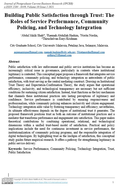 Public satisfaction with law enforcement and public service institutions has become an increasingly critical issue in governance, particularly in contexts where institutional legitimacy is contested. This conceptual paper proposes a framework that integrates service performance, community policing, and technology integration as antecedents of public satisfaction, with trust serving as the central mediating construct. Drawing on Institutional Trust Theory and Expectation-Confirmation Theory, the study argues that operational efficiency, inclusivity, and technological transparency are necessary but not sufficient conditions for sustaining citizen satisfaction. Instead, trust functions as the key mechanism that channels these institutional practices into lasting perceptions of legitimacy and confidence. Service performance is contributed by ensuring responsiveness and professionalism, while community policing enhances inclusivity and citizen engagement. Technology integration adds value by fostering transparency and efficiency; nevertheless, its ultimate effectiveness depends on the degree of institutional trust it generates. The proposed framework positions trust as both an outcome of institutional practices and a mediator that transforms performance and engagement into satisfaction. This paper makes theoretical contributions by combining operational, relational, and technological dimensions within a unified trust-based model of satisfaction. Practical and policy implications include the need for continuous investment in service performance, the institutionalization of community policing programs, and the responsible integration of digital technologies. By highlighting trust as the linchpin of satisfaction, this conceptual study guides future empirical research. It offers a pathway for strengthening legitimacy in public service delivery.