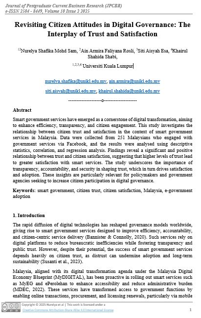 Smart government services have emerged as a cornerstone of digital transformation, aiming to enhance efficiency, transparency, and citizen engagement. This study investigates the relationship between citizen trust and satisfaction in the context of smart government services in Malaysia. Data were collected from 251 Malaysians who engaged with government services via Facebook, and the results were analysed using descriptive statistics, correlation, and regression analysis. Findings reveal a significant and positive relationship between trust and citizen satisfaction, suggesting that higher levels of trust lead to greater satisfaction with smart services. The study underscores the importance of transparency, accountability, and security in shaping trust, which in turn drives satisfaction and adoption. These insights are particularly relevant for policymakers and government agencies seeking to increase citizen participation in digital governance.